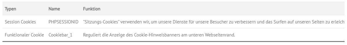 Typen NameFunktionSpeicherdauerSession CookiesPHPSESSIONID"Sitzungs-Cookies" verwenden wir, um unsere Dienste für unsere Besucher zu verbessern und das Surfen auf unseren Seiten zu erleichtern. Das Löschen oder Blockieren dieser Cookies beeinträchtigt die Verwendung unserer Seite und deren Funktionen nicht.Wird nach Schließen des Browsers gelöscht.Funktionaler CookieCookiebar_1Reguliert die Anzeige des Cookie-Hinweisbanners am unteren Webseitenrand.90 Tage